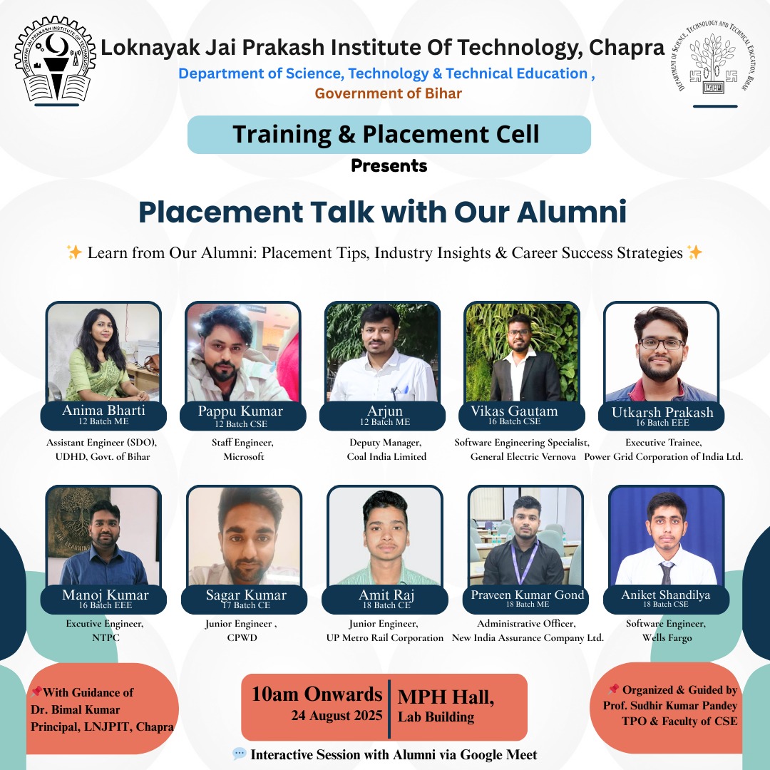 The Alumni Association of LNJPIT, Chapra serves as a dynamic bridge connecting former graduates with their alma mater and current students. Dedicated to fostering lifelong relationships, the Association provides a robust platform for networking, professional development, and meaningful collaboration among alumni.